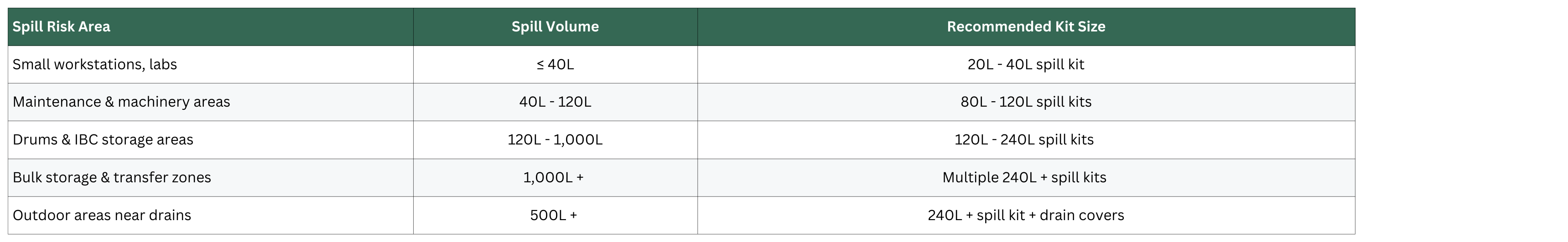 .    1.3  Determine spill volume based on the largest container – If multiple containers are stored, use 100% of the largest container OR 10% of the total volume stored, whichever is greater.  For example, If you store one 1,000    liter IBC, your Spill Kit should absorb at least 1,000 liters, or If you store five 200 liter drums, your Spill Kit should capable to absorb at least 200 liters (largest drum) or 100 liters (10% of total 1,000 liters).
